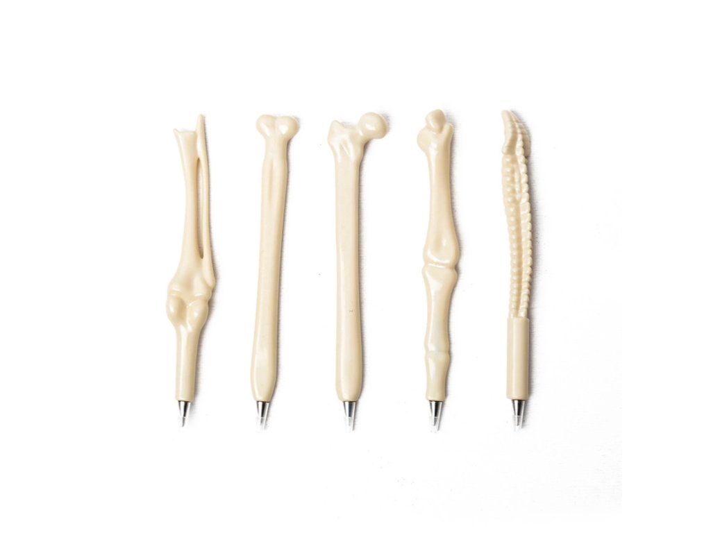 Perá v tvare kostí - dostupné v sade 5 kusov - sú jedinečné písacie nástroje, ktoré určite upútajú pozornosť a vykúzlia úsmev. Ideálne na použitie v ordináciách lekárov, veterinárov alebo fyzioterapeutov, kde anatomická téma môže dodať štipku humoru a originality. Vďaka plynulému písaniu sú perá v tvare kostí tiež perfektné pre každodenné poznámky študentov fyzioterapie alebo anatómie, zaisťujúce pohodlie pri práci aj štúdiu.